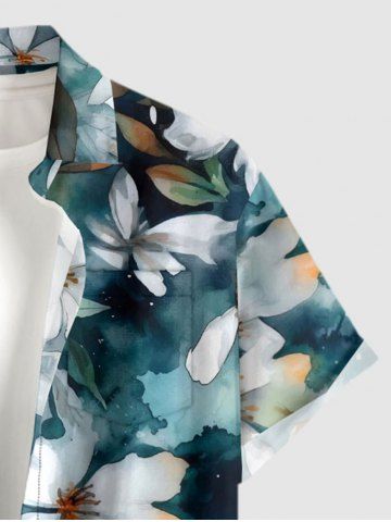 Chemise à Manches Courts> Chemise hawaïenne grande taille pour homme, à imprimé aquarelle de fleurs et de feuilles, boutons et poche.