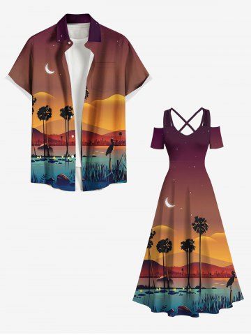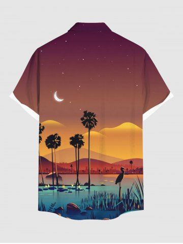 Chemise à Manches Courts> Chemise hawaïenne grande taille pour homme, à imprimé cocotiers, oiseaux et lune, boutons et poche.
