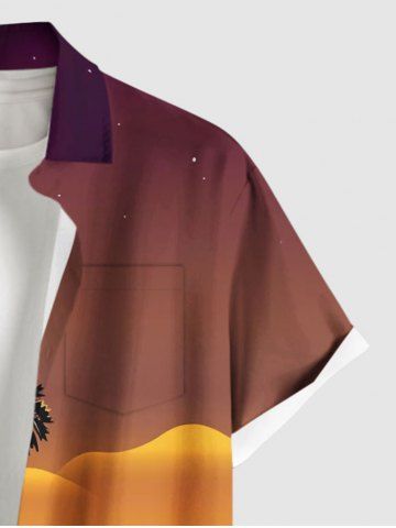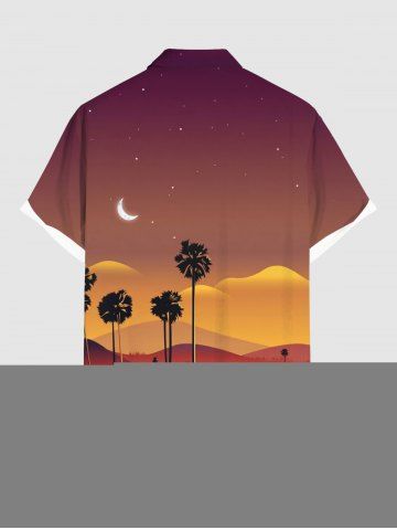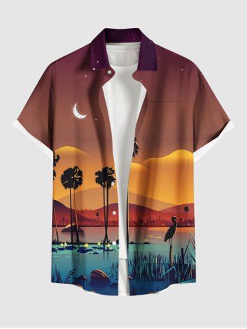 Chemise à Manches Courts> Chemise hawaïenne grande taille pour homme, à imprimé cocotiers, oiseaux et lune, boutons et poche.