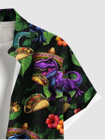 Chemise à Manches Courts> Chemise hawaïenne grande taille pour homme, à imprimé dinosaures, fleurs et feuilles, boutons et poche.