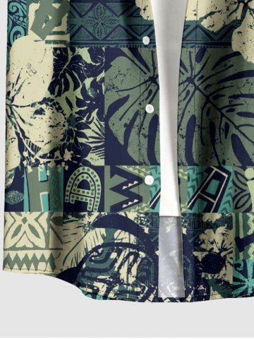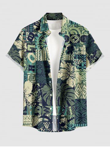 Chemise hawaïenne grande taille pour homme, à imprimé ethnique tropical et fleurs d'hibiscus, avec boutons et poche. - Vert Profond - S