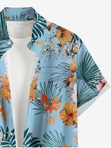 Chemise à Manches Courts> Chemise hawaïenne grande taille pour homme, à imprimé feuilles tropicales et fleurs d'hibiscus, boutons et poche.