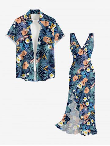 Chemise hawaïenne grande taille pour homme, à imprimé feuilles tropicales et fleurs d'hibiscus, boutons et poche. - Indigo Color - M