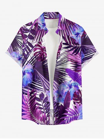 Chemise à Manches Courts> Chemise hawaïenne grande taille pour homme, à imprimé feuilles tropicales et fleurs d'hibiscus, boutons et poche.