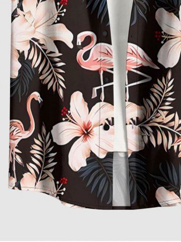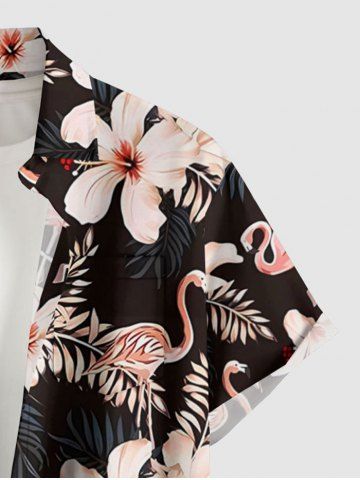 Chemise hawaïenne grande taille pour homme, à imprimé flamants roses et hibiscus, feuilles tropicales, boutons et poche. - Noir - Noir