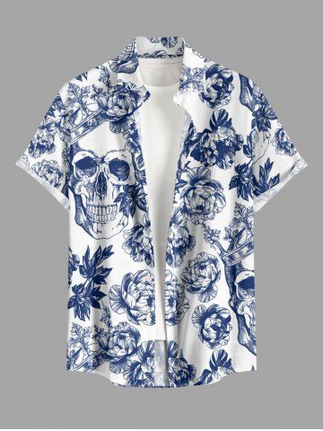 Chemise hawaïenne grande taille pour homme, à imprimé floral et tête de mort, boutons et poche, style couronne. - Bleu Profond - 6xl