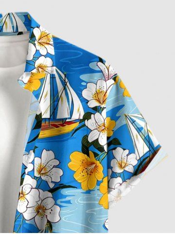 Chemise hawaïenne grande taille pour homme, à imprimé floral, voilier et mer, avec boutons et poche. - Bleu - Bleu