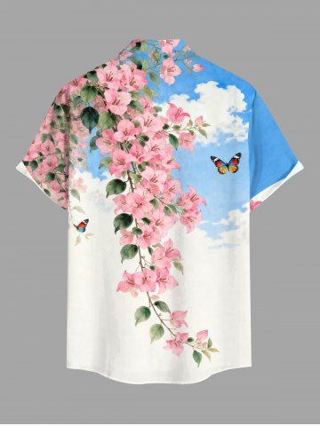 Chemise à Manches Courts> Chemise hawaïenne grande taille pour homme, à imprimé papillons, fleurs, feuilles et nuages, boutons et poche.