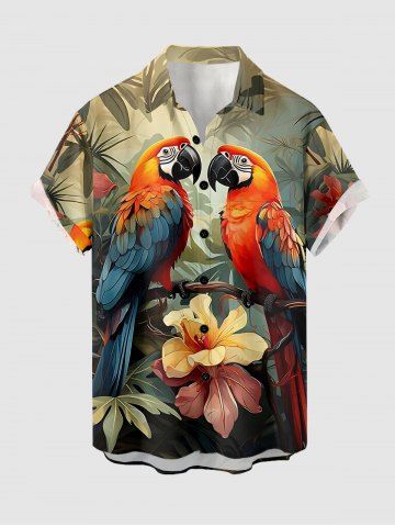 Chemise à Manches Courts> Chemise hawaïenne grande taille pour homme, à imprimé perroquet, fleurs et feuilles, boutons et poche.