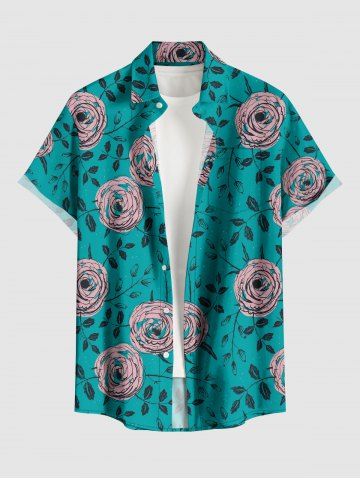 Chemise hawaïenne grande taille pour homme, à imprimé rose et feuilles, boutons et poche. - Turquoise Foncée - 5xl