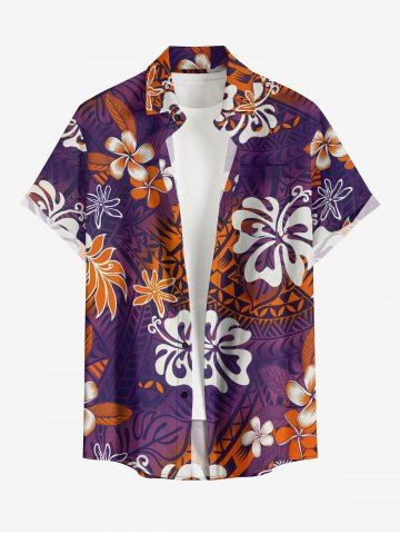 Chemise à Manches Courts> Chemise hawaïenne grande taille pour homme, à imprimé tropical de fleurs d'hibiscus et de feuilles, avec boutons et poche.