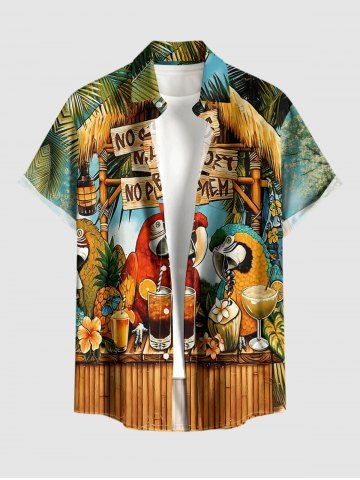 Chemise à Manches Courts> Chemise hawaïenne grande taille pour homme, à motifs perroquets, fleurs, ananas, jus de fruits et paysage marin, avec boutons et poche.