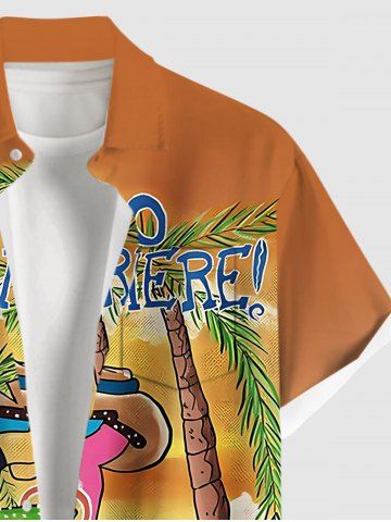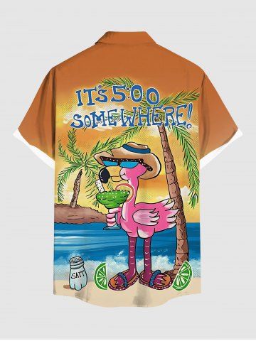 Chemise à Manches Courts> Chemise hawaïenne grande taille pour homme, avec imprimé cocotiers, flamants roses et paysage marin, jus de fruits, boutons et poche. Modèle homme.