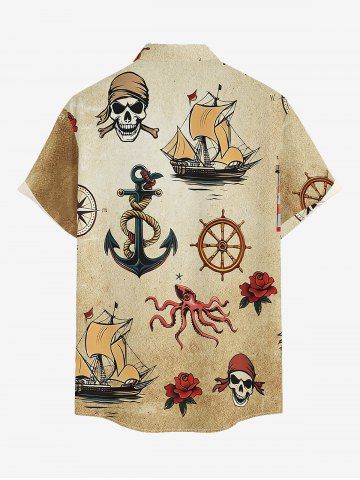 Chemise à Manches Courts > Chemise hawaïenne grande taille pour homme, avec imprimé tête de mort, fleurs, gouvernail, ancre et pieuvre, boutons et poche.