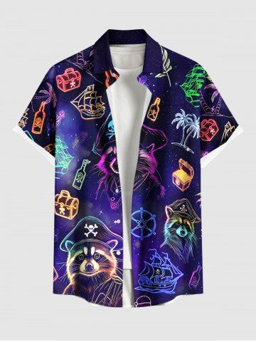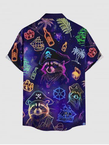 Chemise à Manches Courts> Chemise hawaïenne grande taille pour homme, avec motif raton laveur, pirate, voilier, gouvernail, cocotier et galaxie, boutons et poche.