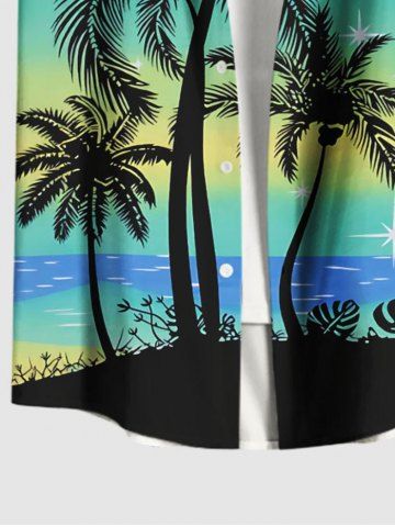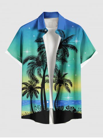 Chemise à Manches Courts> Chemise hawaïenne grande taille pour homme, imprimé ciel et mer ombré, cocotier, boutons et poche.