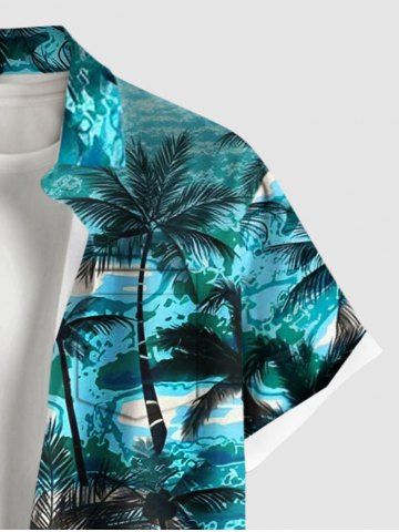 Chemise à Manches Courts> Chemise hawaïenne grande taille pour homme, imprimé cocotiers et vagues, avec poches et boutons.