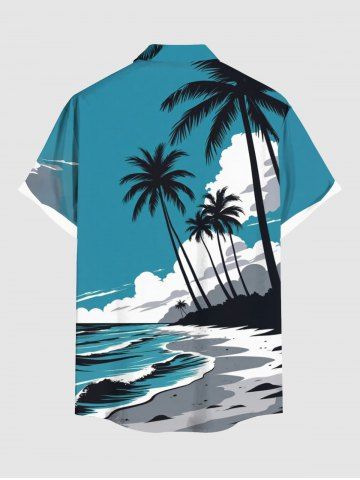 Chemise à Manches Courts> Chemise hawaïenne grande taille pour homme, imprimé cocotiers, vagues et nuages, avec poches et boutons. Motif : paysages marins, vagues et cocotiers.