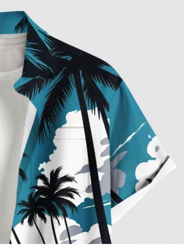 Chemise à Manches Courts> Chemise hawaïenne grande taille pour homme, imprimé cocotiers, vagues et nuages, avec poches et boutons. Motif : paysages marins, vagues et cocotiers.