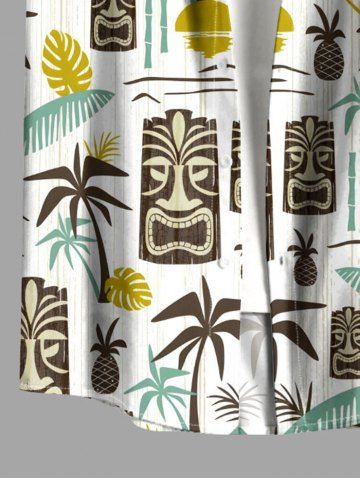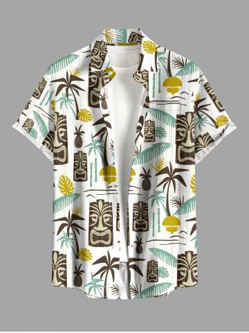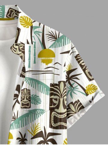 Chemise à Manches Courts> Chemise hawaïenne grande taille pour homme, imprimé ethnique feuille de cocotier et masque soleil, boutons et poche.