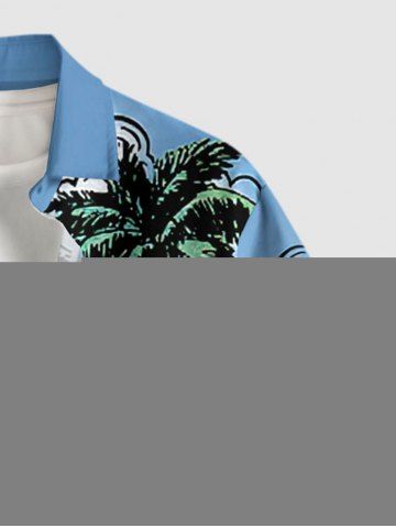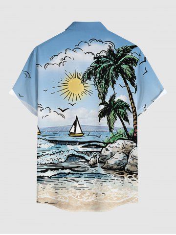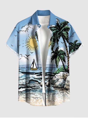 Chemise hawaïenne grande taille pour homme, imprimé paysage marin, cocotier, soleil, bateau et vagues, boutons et poche. - Bleu Ciel - Bleu Ciel