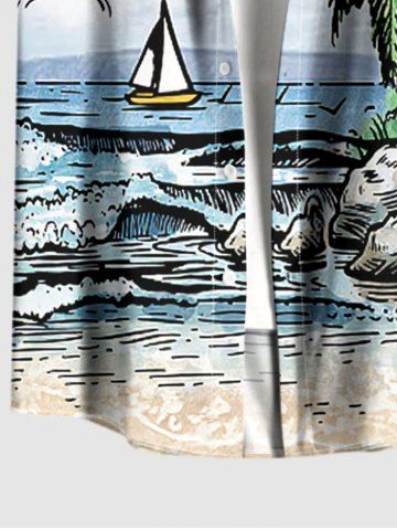 Chemise à Manches Courts> Chemise hawaïenne grande taille pour homme, imprimé paysage marin, cocotier, soleil, bateau et vagues, boutons et poche.
