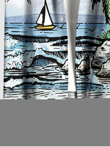 Chemise à Manches Courts> Chemise hawaïenne grande taille pour homme, imprimé paysage marin, cocotiers, soleil, bateau et vagues, boutons et poche.