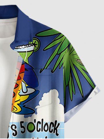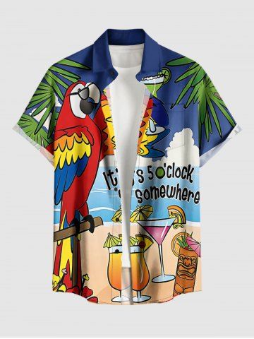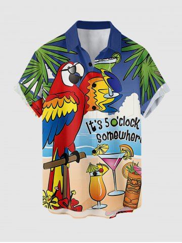 Chemise hawaïenne grande taille pour homme, imprimé perroquet, jus de fruits, cocotier, nuage et paysage marin, boutons et poche. - Bleu Profond - M