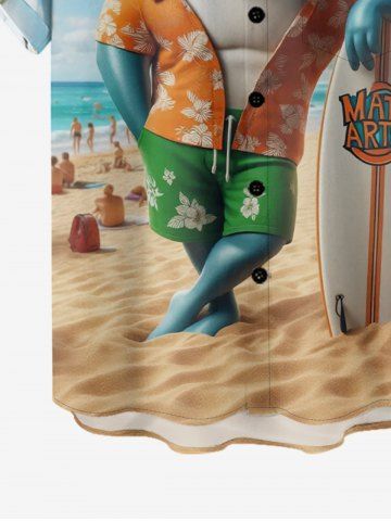 Chemise à Manches Courts> Chemise hawaïenne grande taille pour homme, imprimé requin, cocotier et paysage marin, boutons et poche.