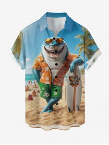 Chemise hawaïenne grande taille pour homme, imprimé requin, cocotier et paysage marin, boutons et poche. - Bleu Ciel - Bleu Ciel