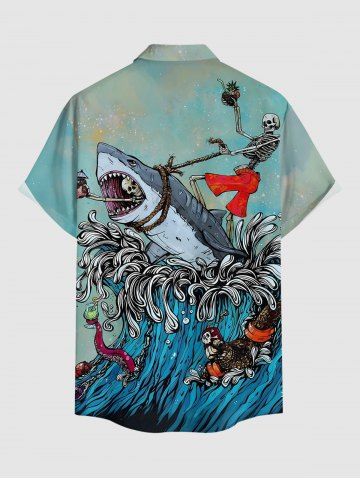 Chemise hawaïenne grande taille pour homme, imprimé squelette de requin et vagues, boutons et poche. - Bleu-gris - L