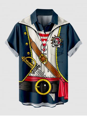 Chemise à Manches Courts> Chemise hawaïenne grande taille pour homme, imprimée avec un motif de crâne, un gouvernail et un couteau de pirate, avec poches et boutons.