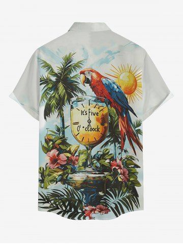 Chemise à Manches Courts> Chemise hawaïenne grande taille pour homme, imprimée cocotier, perroquet et horloge soleil, avec boutons et poche.