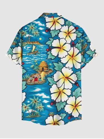 Chemise à Manches Courts> Chemise hawaïenne grande taille pour homme, imprimée cocotiers et hibiscus, paysage marin, boutons et poche.