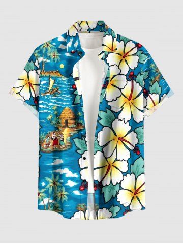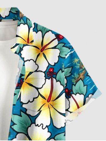 Chemise à Manches Courts > Chemise hawaïenne grande taille pour homme, imprimée cocotiers et hibiscus, paysage marin, boutons et poche.