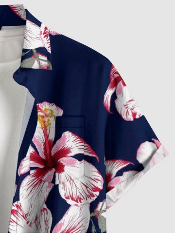 Chemise hawaïenne grande taille pour homme, imprimée de fleurs d'hibiscus, à boutons et poches. - Bleu De Minuit - 4xl