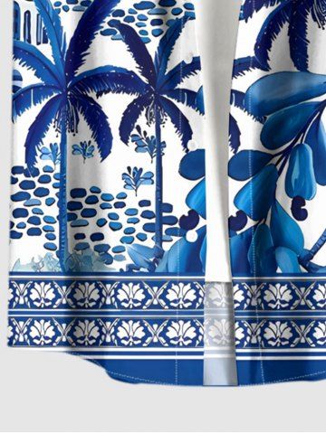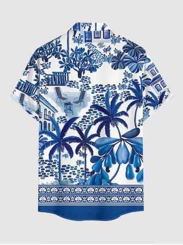 Chemise hawaïenne grande taille pour homme, imprimée style porcelaine bleue et blanche, motif cocotier et chemin de cour, bleu et blanc. - Bleu - Bleu