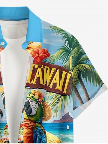 Chemise hawaïenne grande taille pour homme, ornée de fleurs d'hibiscus, de feuilles et d'un imprimé paysage marin, avec boutons et poche. Motif perroquets, hibiscus et fleurs. - Bleu - Bleu