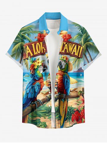 Chemise à Manches Courts> Chemise hawaïenne grande taille pour homme, ornée de fleurs d'hibiscus, de feuilles et d'un imprimé paysage marin, avec boutons et poche. Motif perroquets, hibiscus et fleurs.