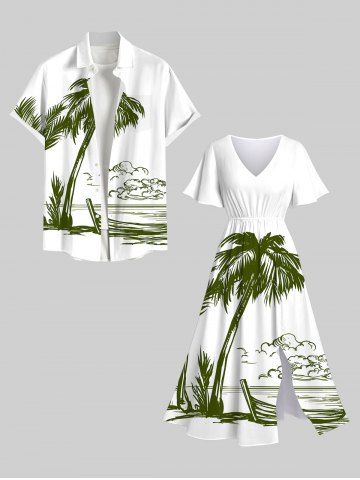 Chemise Imprimé Cocotier Derrière la Montagne Grande Taille avec Poches - Blanc - Blanc