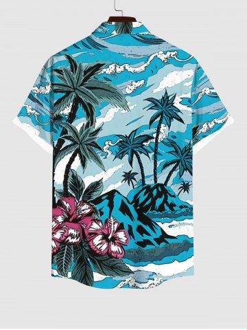Chemise Imprimé Cocotier et Feuille Floral à Boutons Grande Taille avec Poche - Bleu Clair - Bleu Clair
