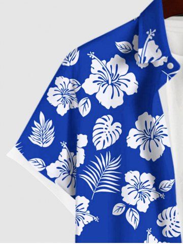 Chemise hawaïenne grande taille à imprimé feuilles tropicales et fleurs d'hibiscus pour homme - Bleu Profond - S