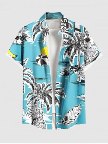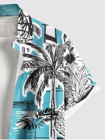 Chemise Imprimé Cocotier et Feuilles Tropicales à Boutons Grande Taille avec Poche - Bleu Clair - Bleu Clair