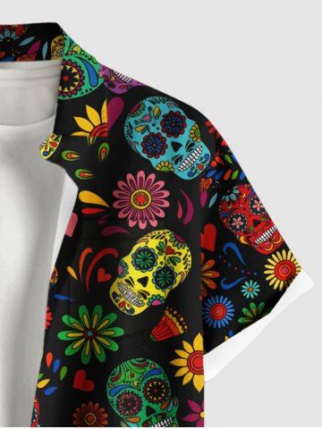 Chemise Imprimé Coeur Floral et Crâne Grande Taille avec Poches à Boutons pour Homme - Noir - Noir