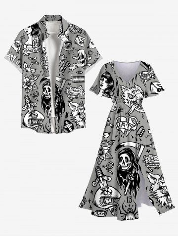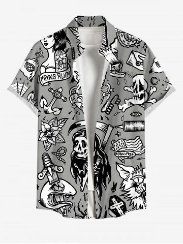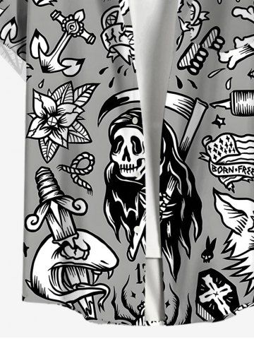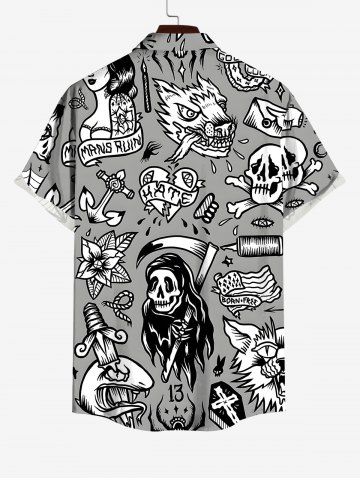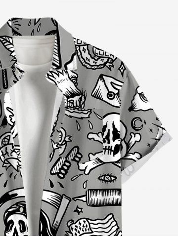 Chemise Imprimé Crâne et Coeur à Boutons Grande Taille avec Poche pour Homme - Noir - Noir