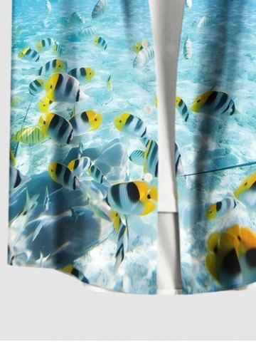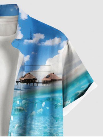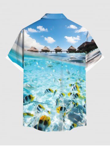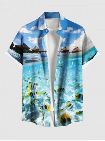 Chemise Imprimé Paysage de Poisson 5 Boutons avec Poche Grande Taille pour Homme - Bleu Clair - Bleu Clair
