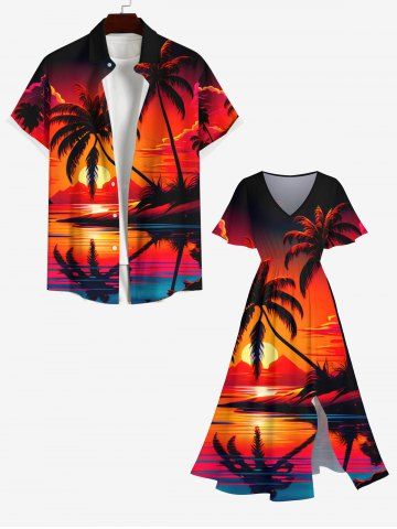 Chemise à Manches Courts> Chemise Ombre à Imprimé Coucher de Soleil Montagne et Cocotiers avec Poche Grande Taille pour Homme