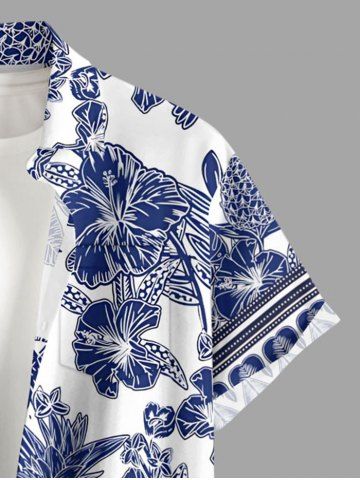 Plus Size Blue And White Porcelain Pineapple Hibiscus Flower Leaf Print Buttons Pocket Hawaii Shirt For Men - Bleu - Bleu