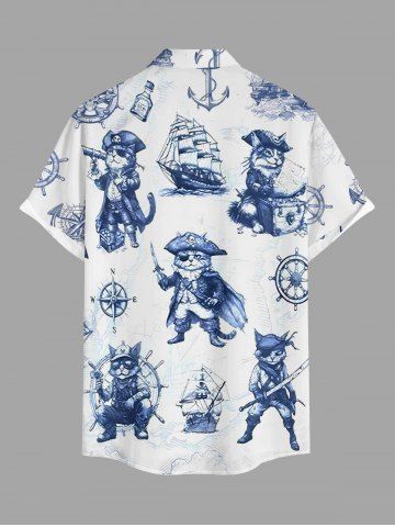 Plus Size Cat Pirate Ship Rudder Cruise Print Buttons Pocket Hawaii Shirt For Men - Blanc - Blanc
