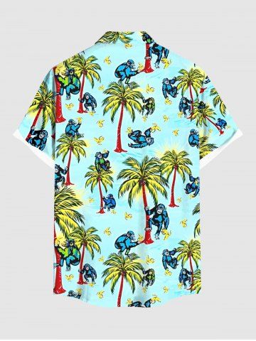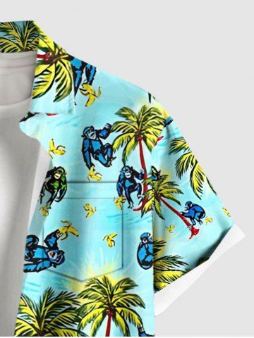 Plus Size Coconut Tree Banana Gorilla Print Buttons Pocket Hawaii Shirt For Men - Turquoise - Turquoise